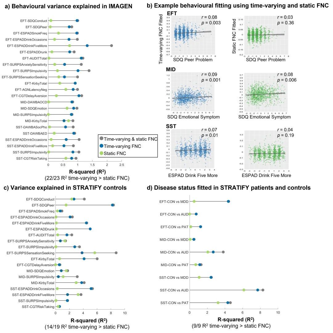 在与行为学的关联方面,与传统的静态连接指标相比,基于动态网络的任务特异性连接对认知分数和精神健康症状的解释量更高。为了验证结果的可重复性,研究团队在独立数据集STRATIFY队列(包含528名重度抑郁症、酒精依赖患者和健康对照者)中进行了验证。结果证实,在独立数据集上,同样可以得到4种反复出现的FNC状态,并且FNC状态与任务刺激出现的关联模式可以得到验证。重要的是,基于动态脑网络的功能连接能更好的区分患者与健康对照者,提示动态功能连接对精神症状有更高的解释力,提供了脑与行为关联的新思路。