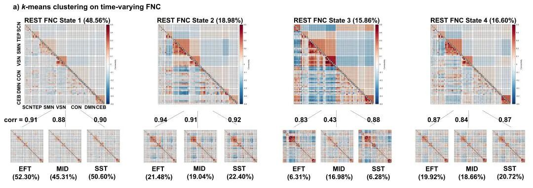 首先,在全脑连接层面,研究者发现大脑存在几种固有的连接模式(即FNC状态),这几种FNC状态在静息态和任务态下,表现出高度相似的连接模式。