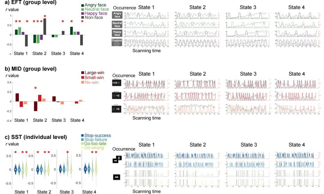 尽管连接模式相似,但在任务条件下,这些FNC状态出现频率波动与实验刺激的出现高度相关,或随时间线性变化,例如,状态1:表现为全脑水平的弱正连接,在认知加工过程中,当被试专注于应对任务中最核心的刺激(如面孔或大额奖励)时,这种状态出现会显著增加;状态2:表现为初级网络(视觉、运动)与高级网络(认知控制、默认网络)的显著分离。在任务控制条件出现时,该状态受到抑制;状态3:在情绪面孔与认知抑制任务中,其出现频率随时间线性增加,并且与认知抑制任务的Go信号遗漏错误显著相关,提示与警觉性下降状态有关;状态4:与状态1连接模式相似,但是具有更高的模块化水平,其出现与特定的情绪加工(如愤怒面孔)出现相关。