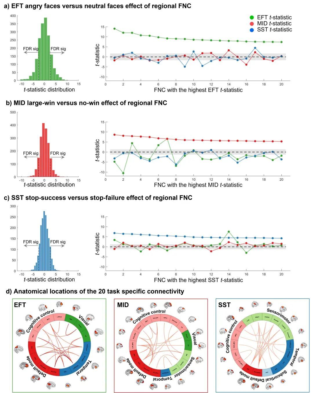 进一步,研究探讨了在局部脑区的功能连接水平上,连接强度的变化是否可以更精细地区分任务条件(例如情绪面孔加工中愤怒面孔条件对比中性面孔条件;金钱奖赏任务中大额奖赏对比无奖赏条件;认知抑制任务中成功抑制对比抑制失败条件)。结果发现,能够区分情绪面孔条件的局部连接对于奖赏加工和认知抑制条件的区分能力较差,同样,区分奖赏加工和认知抑制的局部连接对于其他任务条件的区分能力较差,提示局部脑区功能连接具有任务加工特异性。