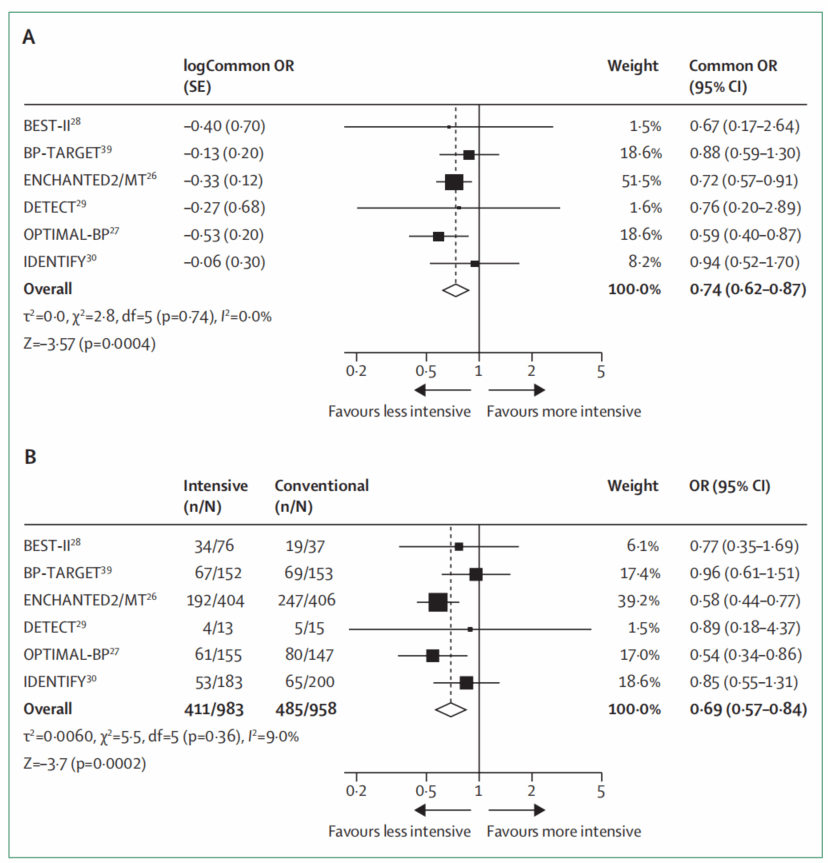 试验设计对比了强化降压组(目标收缩压<120 mmHg或<130 mmHg)与标准/降压组(目标收缩压140-180 mmHg)的临床结局。令人警醒的是,这些研究均因强化降压组表现出明确的伤害信号而被数据安全监察委员会(DSMB)建议提前终止。荟萃分析的结果进一步证实,强化降压与患者90天后更差的功能恢复(以改良Rankin量表mRS评分为指标)显著相关。