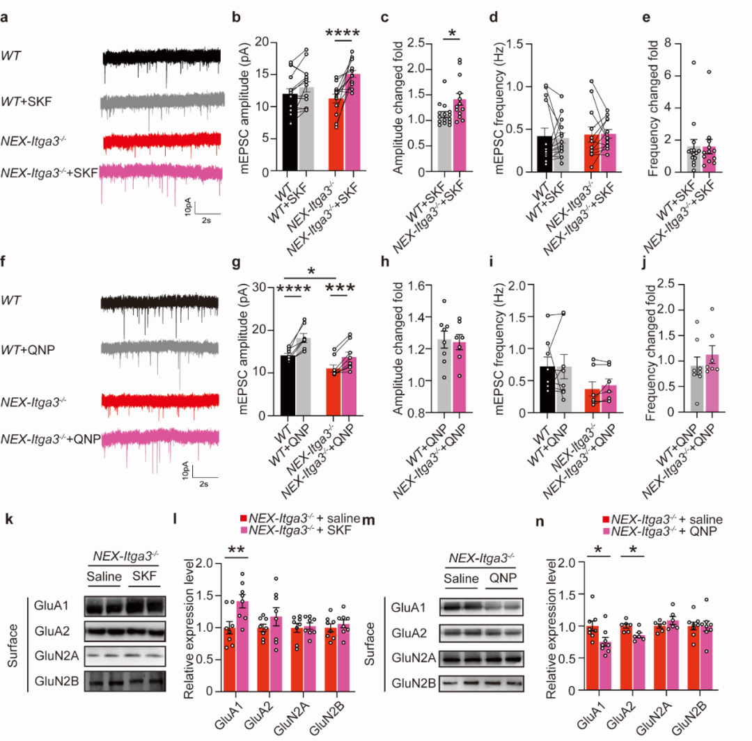 ▲ 图5 SKF81297改善NEX-Itga3-/-小鼠AMPAR的电生理特性和突触后膜分布