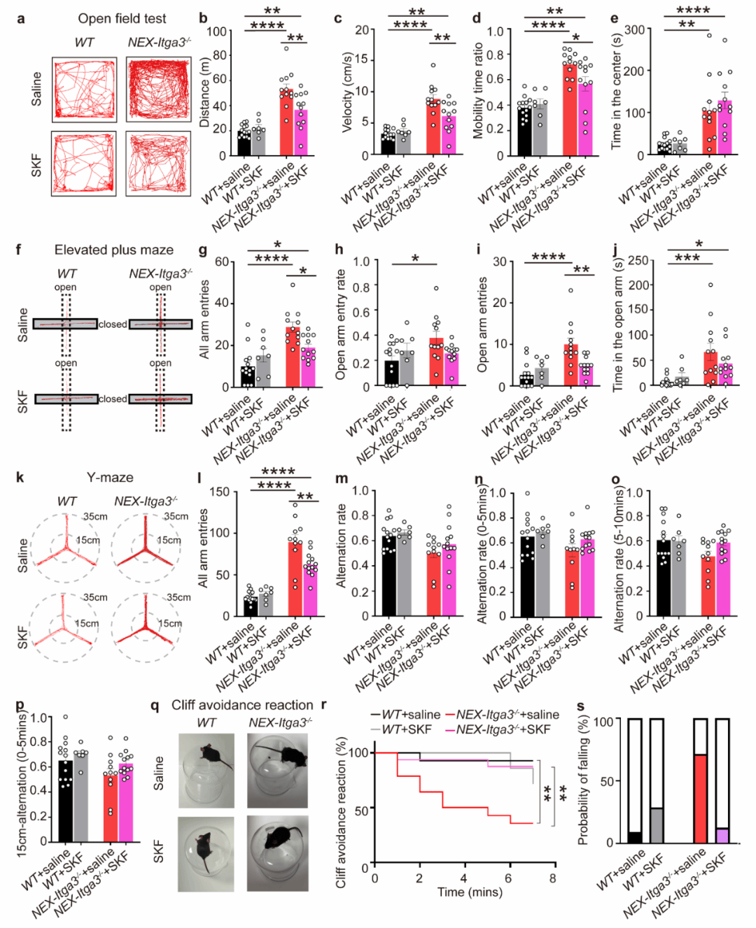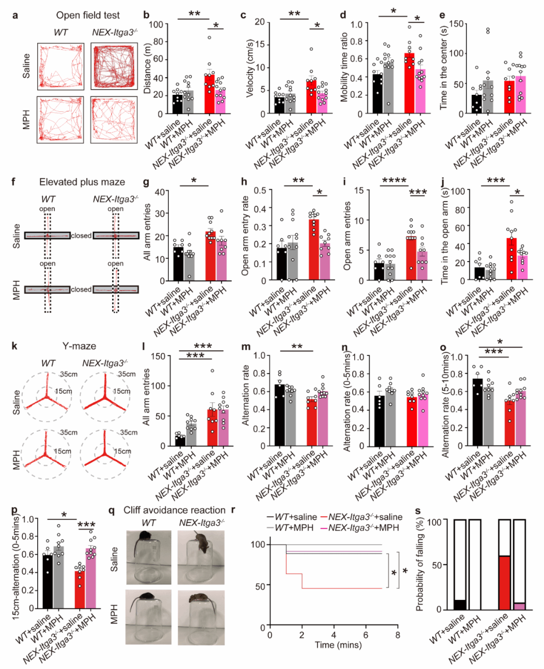 考虑到哌甲酯(MPH)是临床治疗 ADHD 的一线药物,研究团队对 NEX-Itga3⁻/⁻ 小鼠进行腹腔注射 MPH。行为学结果显示,MPH 可显著改善敲除小鼠的多动、冲动及注意力相关缺陷,在旷场、高架十字迷宫、Y 迷宫及避崖反应等多项测试中均表现出明显疗效(图3)。