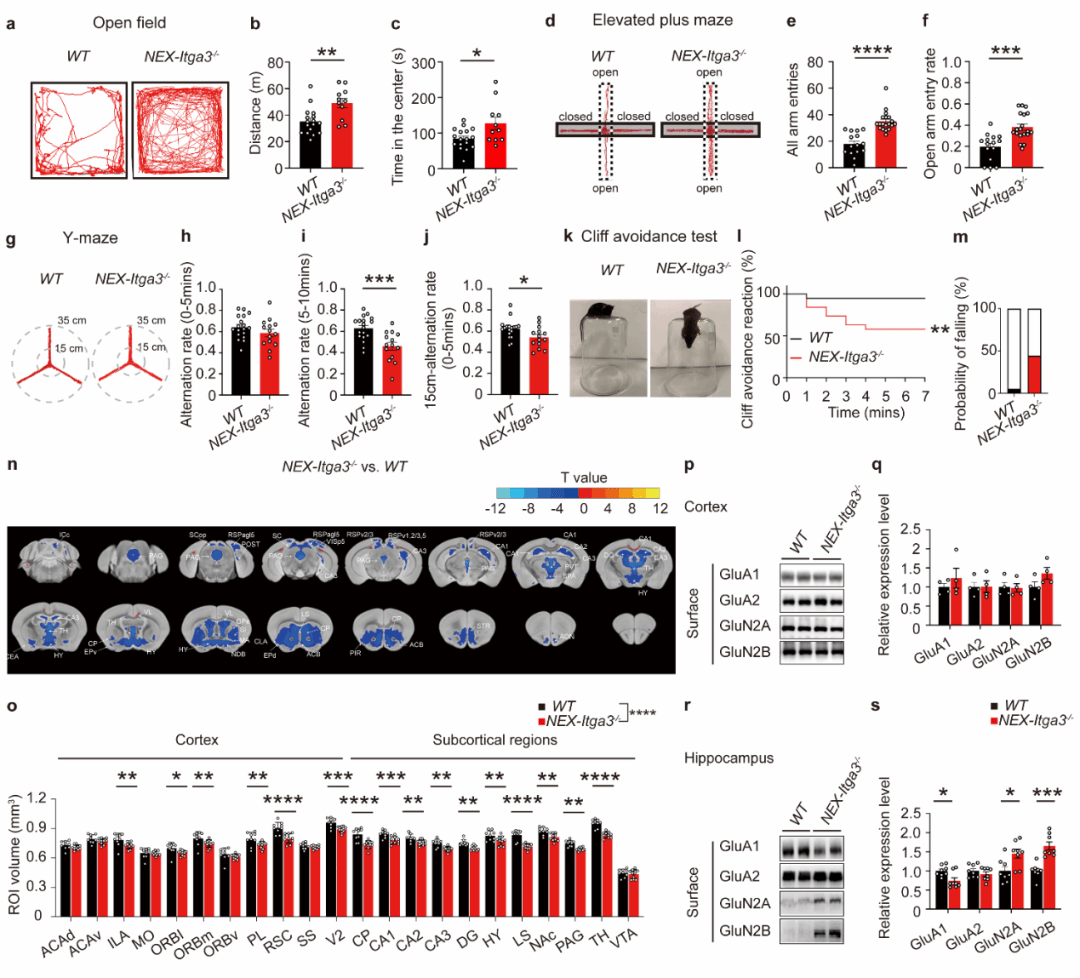 研究团队构建了前脑兴奋性神经元特异性整合素 α3 缺失小鼠(NEX-Itga3⁻/⁻),并在 P31 阶段系统评估其行为、脑结构及突触受体特征。结果显示: