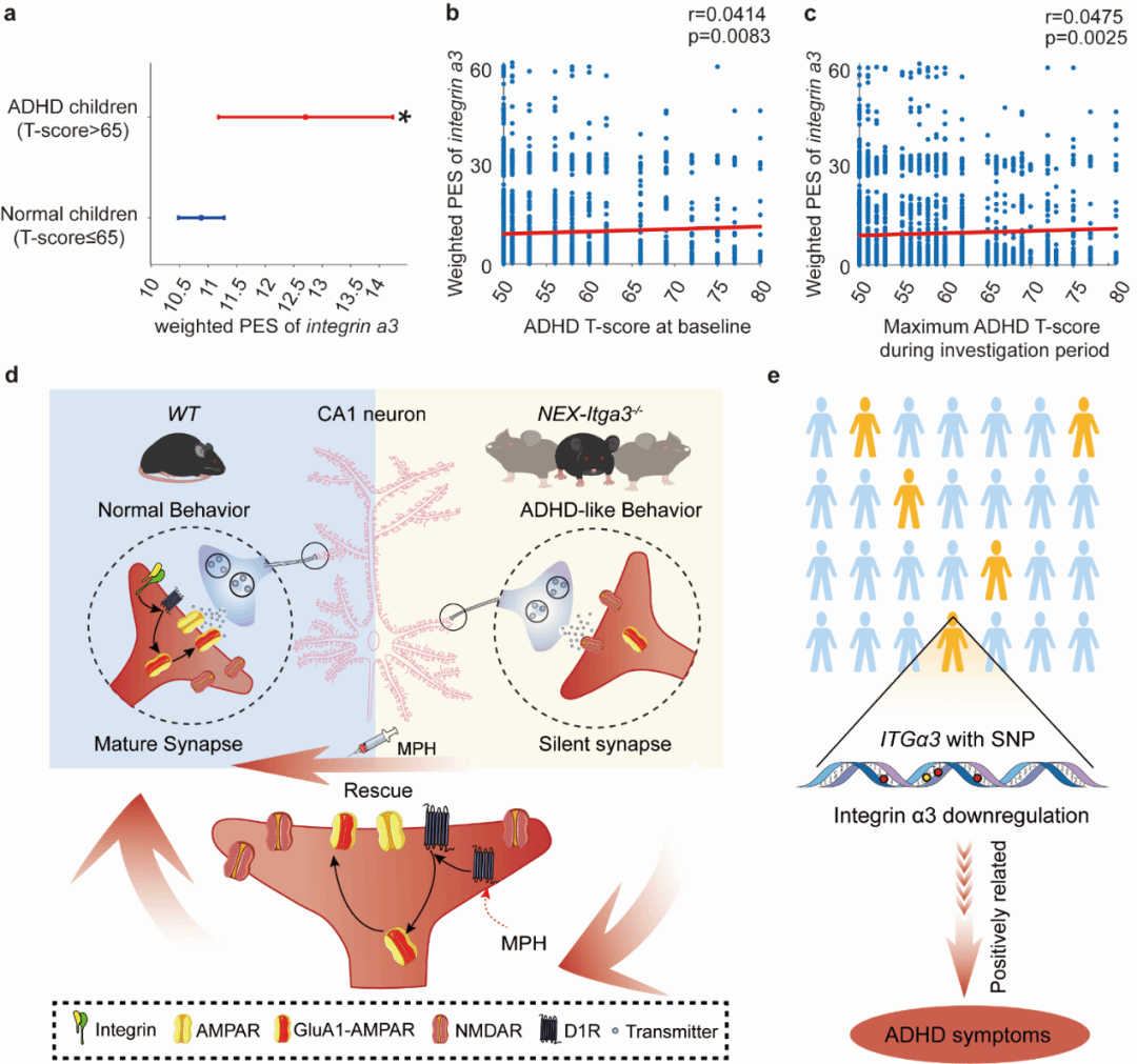 注意力缺陷多动障碍(ADHD)是儿童和青少年中最常见的神经发育障碍之一,主要表现为注意力不集中、多动和冲动行为,严重影响学习、社会功能及心理健康。尽管大量研究已揭示 ADHD 与额叶–纹状体环路功能异常及多巴胺信号紊乱密切相关,但越来越多的影像学和临床研究提示:海马结构与功能异常同样可能参与 ADHD 的发生发展。然而,海马脑区在 ADHD 发病机制中的具体作用及其分子基础,长期缺乏直接证据。整合素(integrins)是一类由 α、β 亚基组成的细胞黏附分子,广泛参与神经元迁移、树突发育、突触稳定及可塑性调控,是神经发育和突触成熟的重要分子基础。其中,整合素 α3 在兴奋性突触发育中的作用逐渐受到关注,但其功能异常是否与 ADHD 相关,尚不清楚。