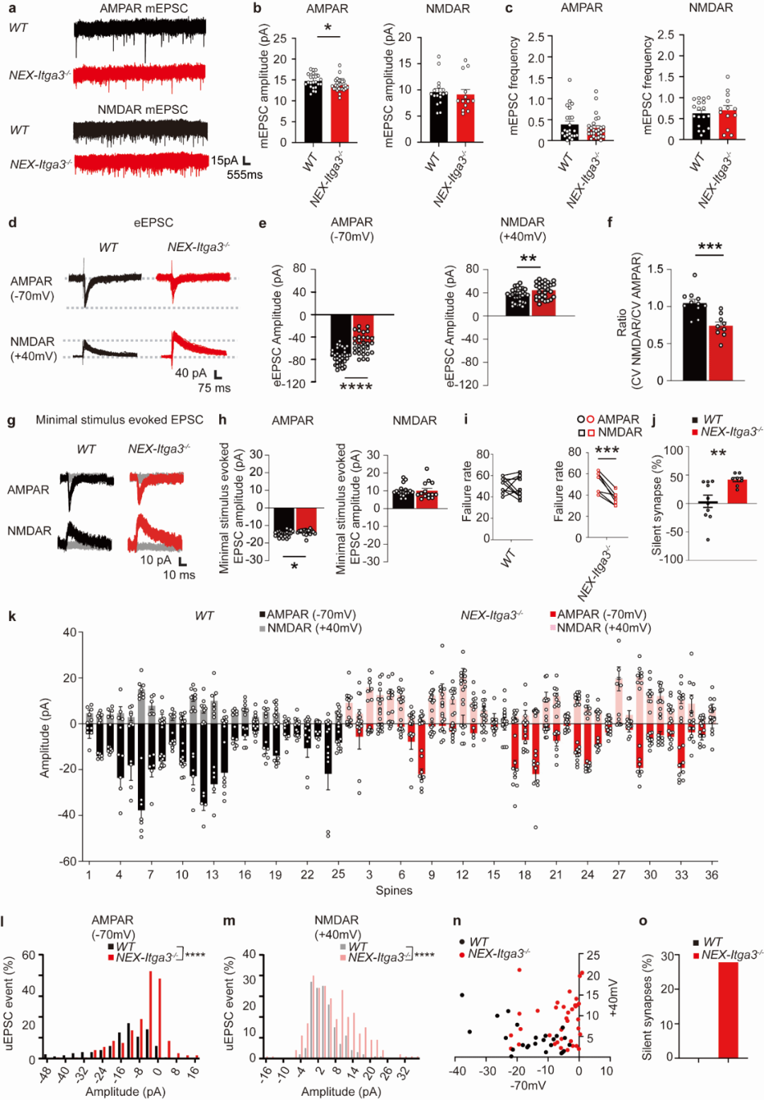 ▲ 图2 Itgα3 缺失损害海马脑区突触后 AMPAR 功能并阻碍突触成熟