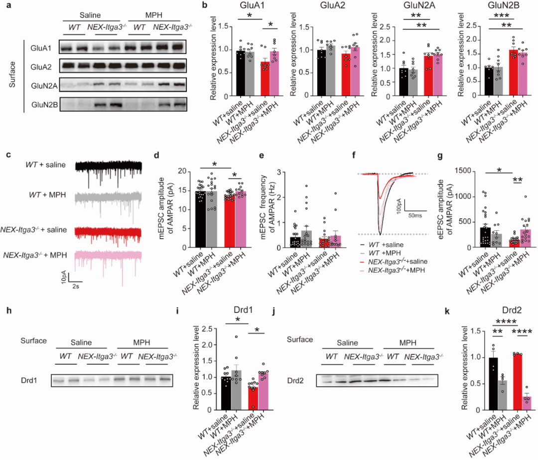 ▲ 图4 MPH增加NEX-Itgα3-/-海马CA1区突触后膜AMPAR数量并恢复其功能